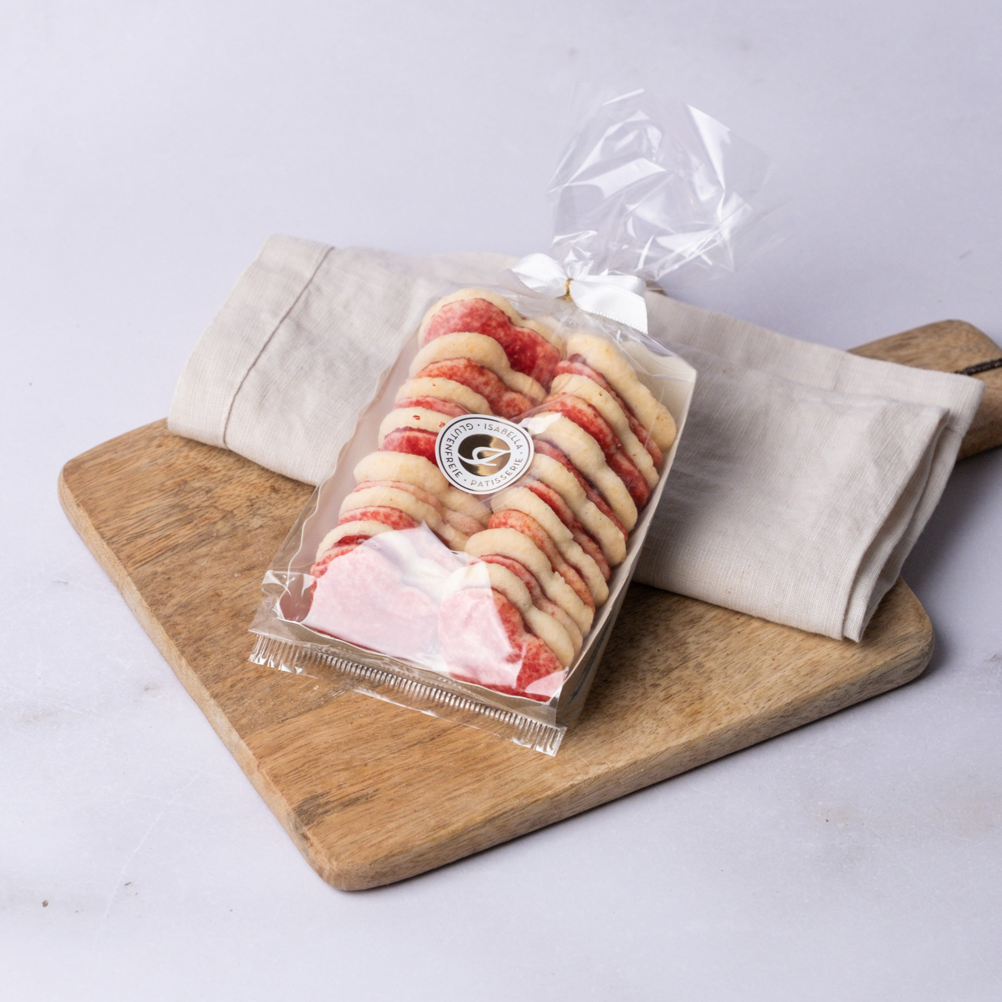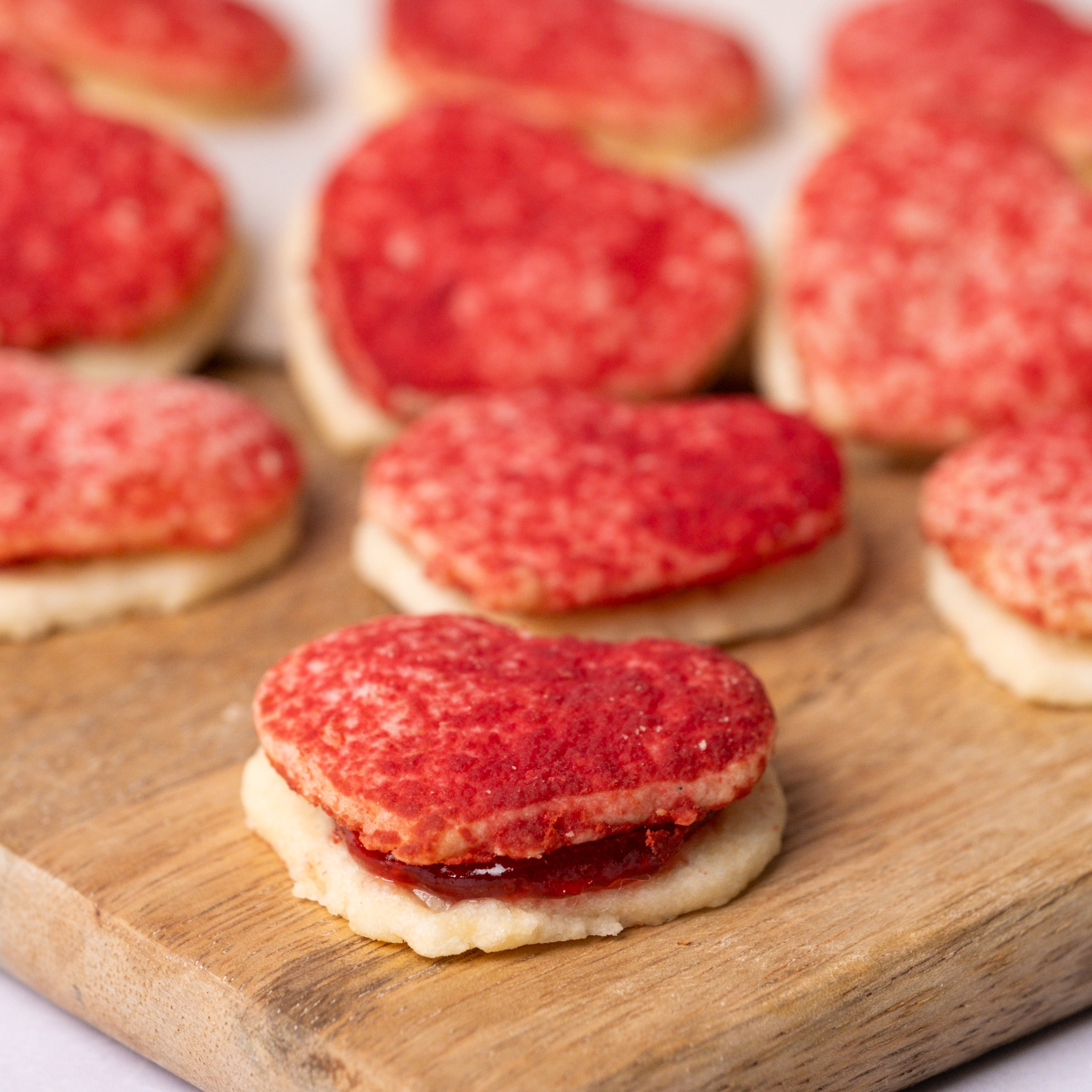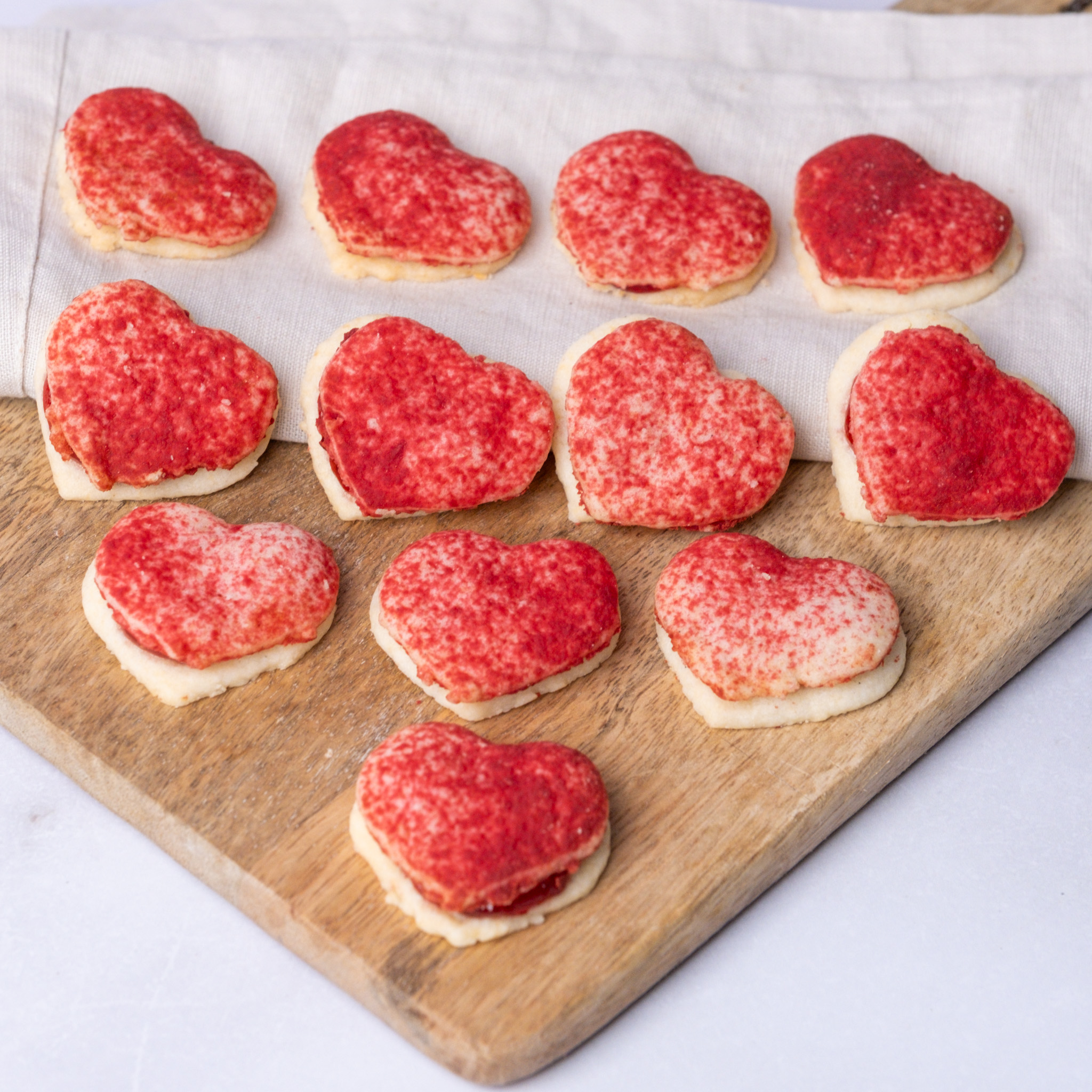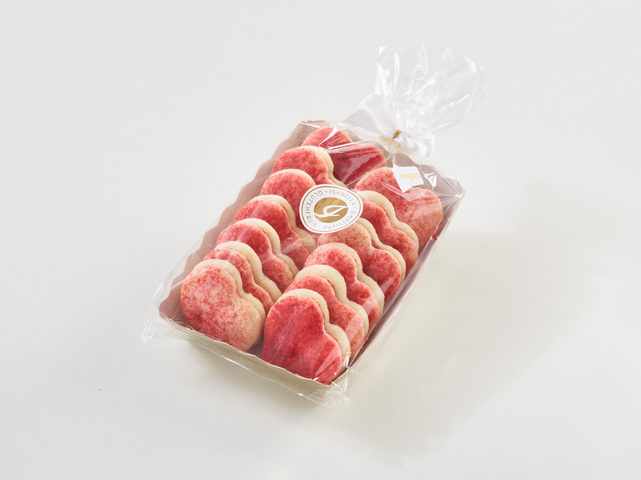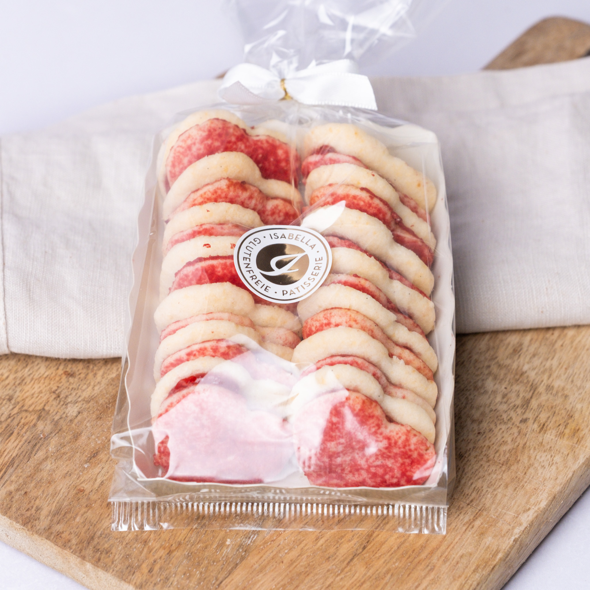 Sind die nicht herzig? Unsere glutenfreien und komplett veganen Himbeer Herzen machen nicht nur vom Aussehen richtig was her, sondern sind auch noch unheimlich lecker. Dazu füllt Isabella feines Himbeer-Mandelgebäck mit fruchtiger Himbeer-Konfitüre, die mit Himbeerpulver verfeinert ist. Zusätzlich sind die Leckereien übrigens komplett vegan sowie mais- und hefefrei.